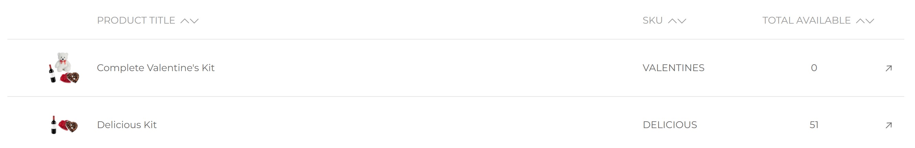 Let's step through an example of Kit Builder operation. The "Complete Valentines Kit" with SKU VALENTINES that you configured earlier is ready to be purchased! During creation, the component inventory levels were:
